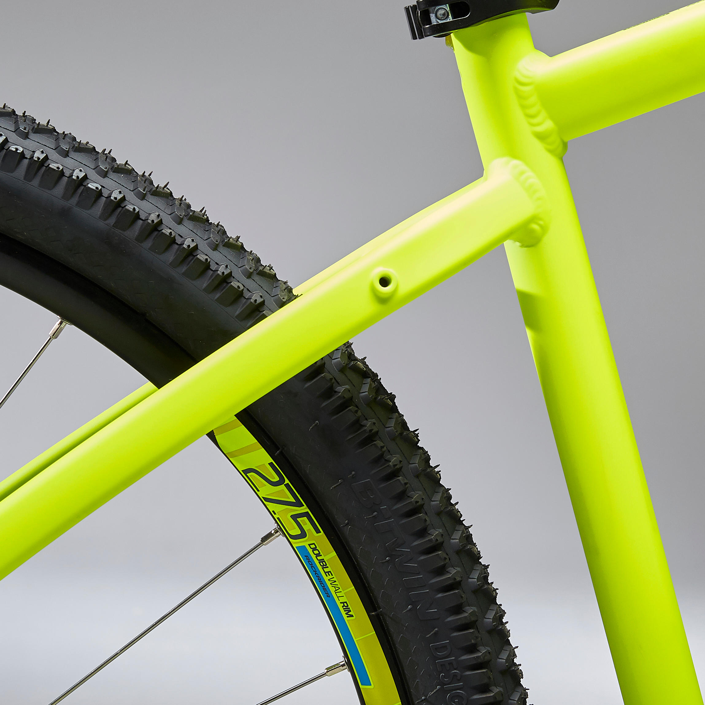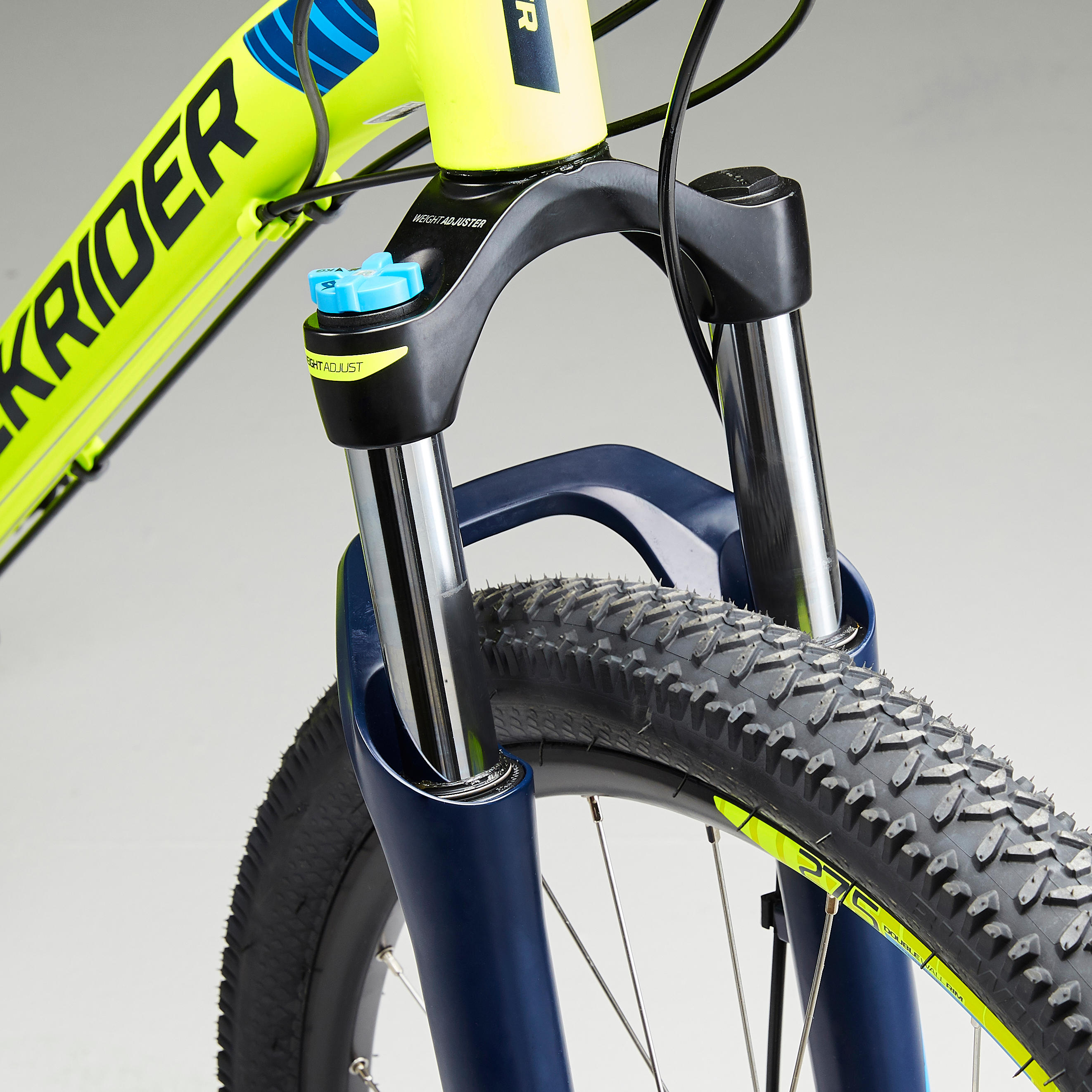 צמיגי ה-27.5" X 2.0 B'TWIN ALL TERRAIN DRY הבלעדיים מותאמים לקרקע יבשה. קוביות הצד מעניקות אחיזה טובה בפניות. החלק המרכזי בסוליה שלהם מספק ביצועים טובים וקוביות הצד מעניקים אחיזה טובה בפניות.