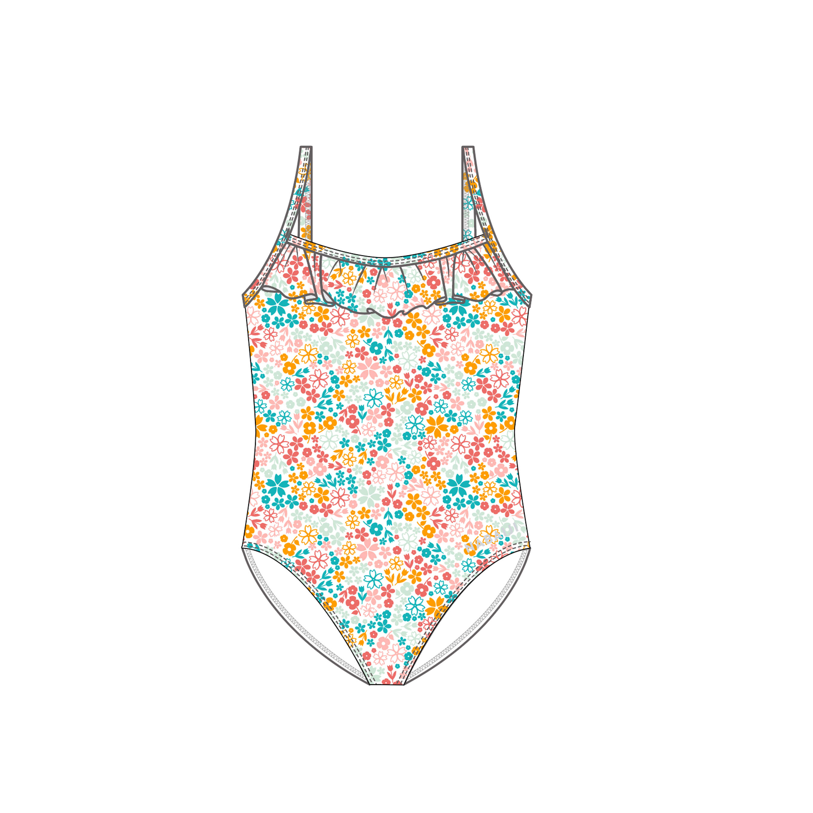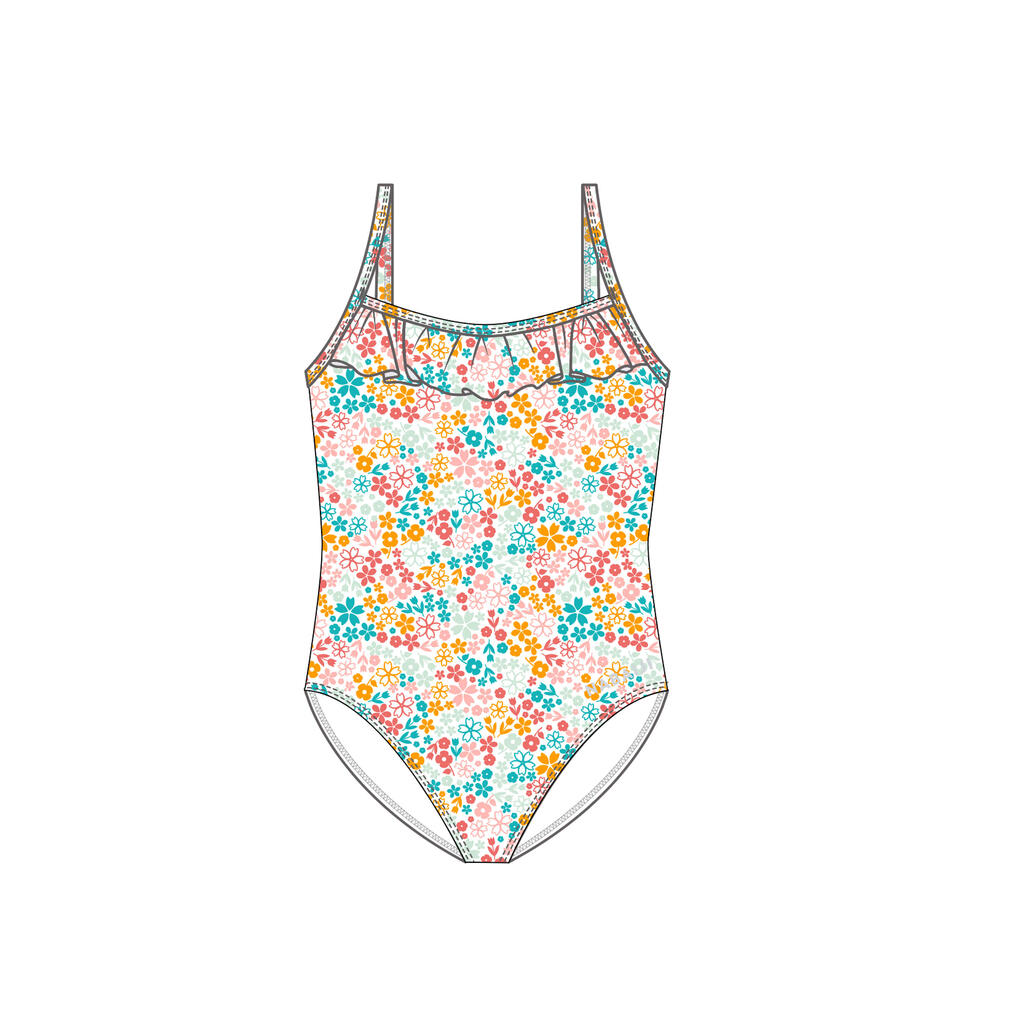 בגד הים השלם הראשון שלה, עם כתפיות דקות ישרות בגב שקל מאוד ללבוש! הבונוס הקטן שלו? הדפסים בהירים וסלסולים!