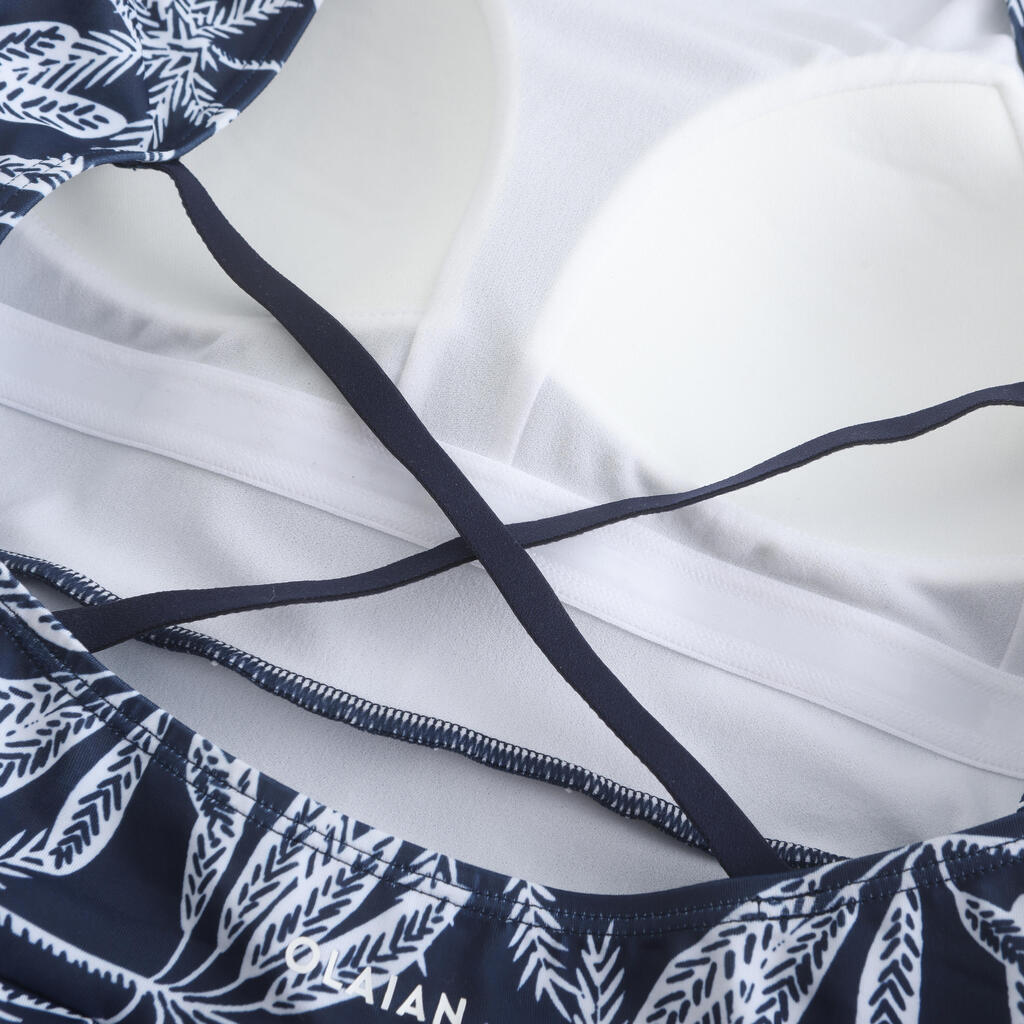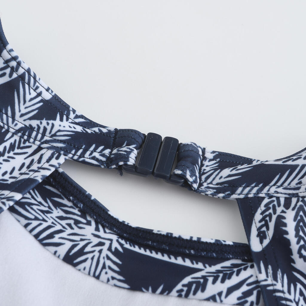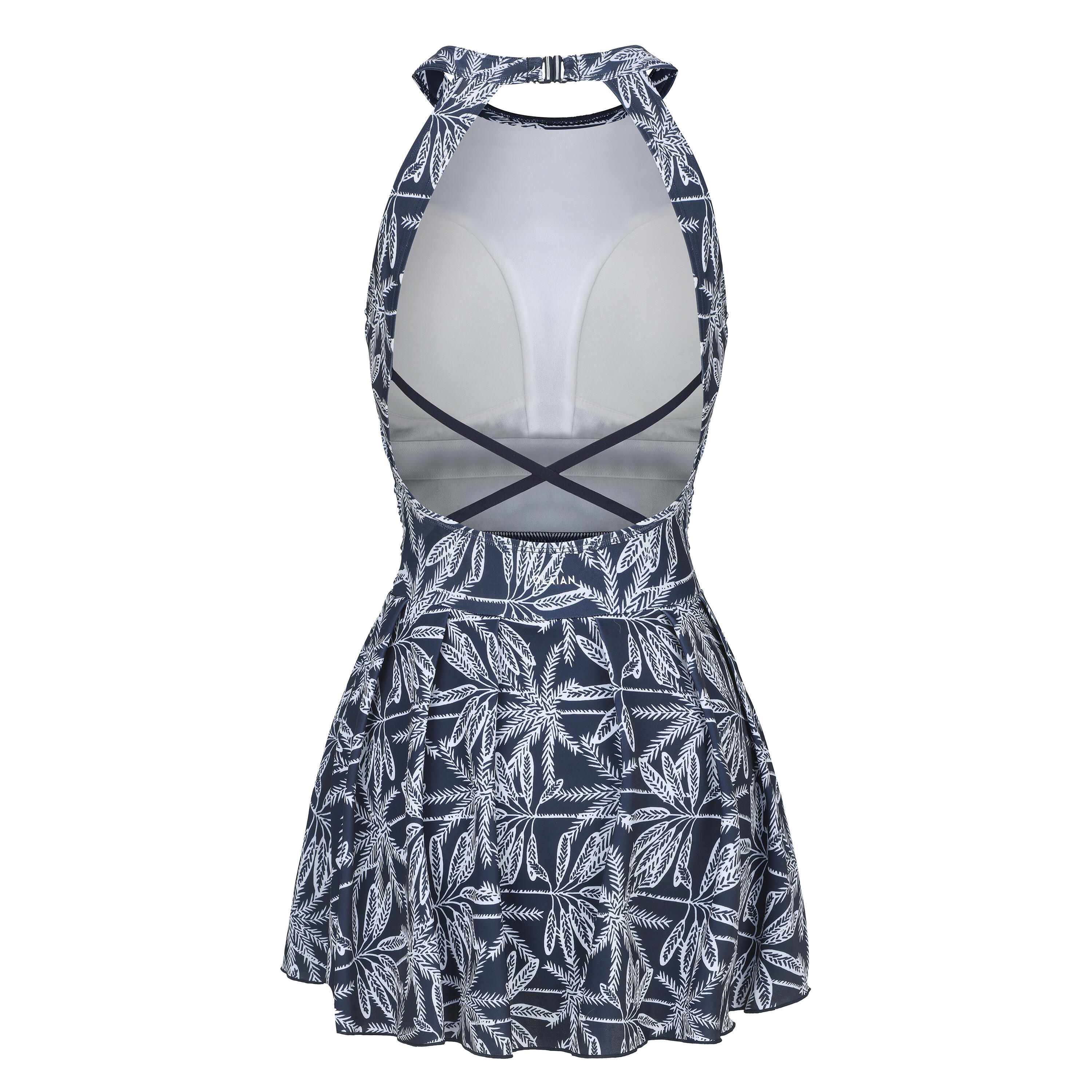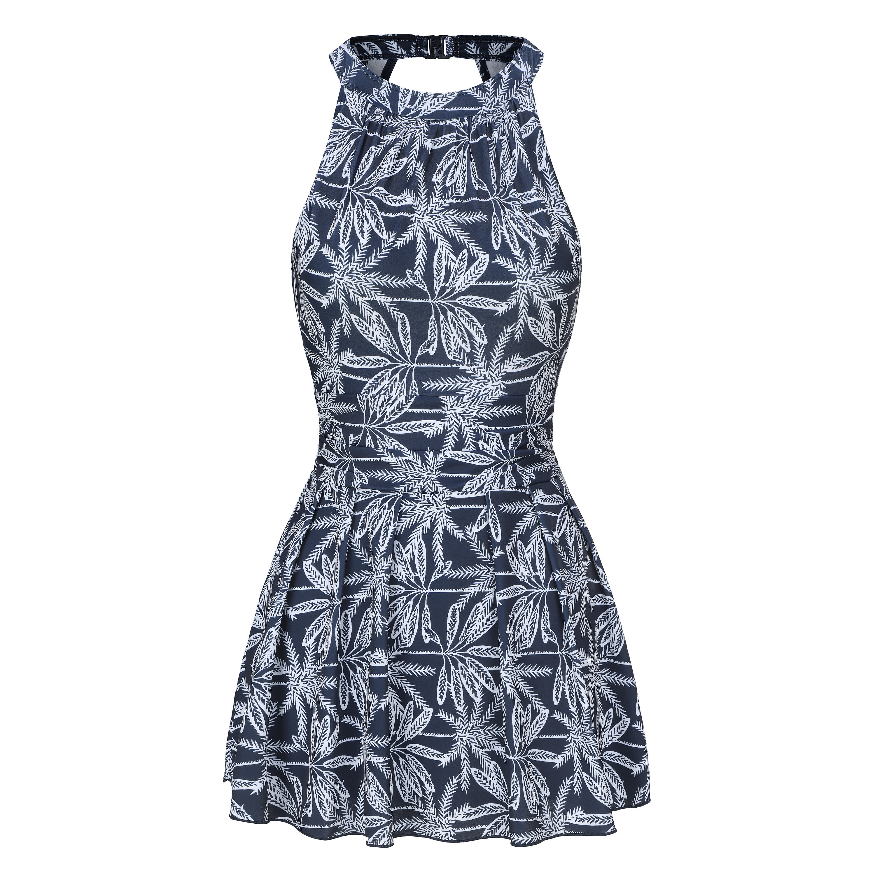 בגד ים שלם זה לנשים בגזרת קולר, עם חצאית מיני, כיווצים בצדדים וקולר קשירה, כולל גב סגור להתאמה טובה יותר