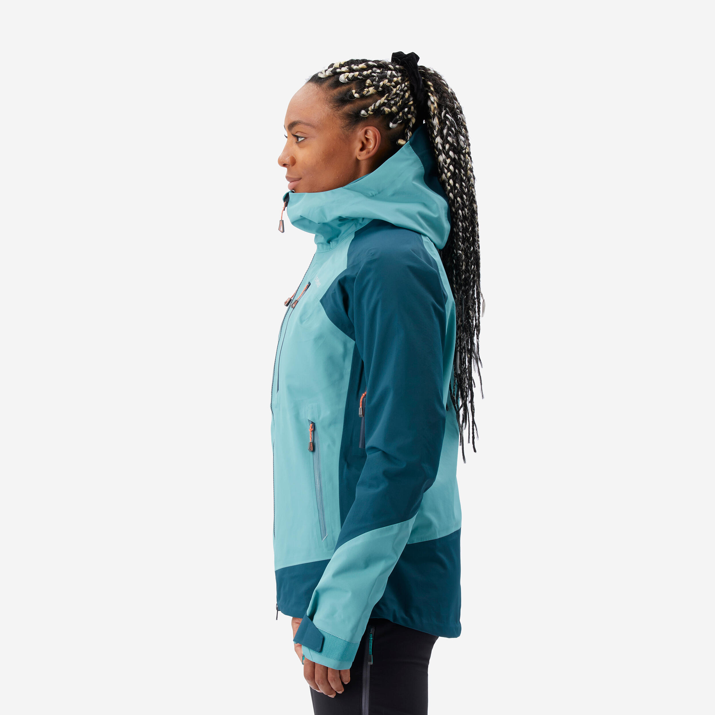 גודל הברדס של מעיל EVO MOUNTAINEERING הופך אותו למתאים לחבישת קסדה בעת טיפוס הרים. הגובה והעומק שלו מתכווננים בהתאם לצרכים שלכן. מצחייה קשיחה למחצה מספקת הגנה טובה יותר על המצח והעיניים. הצווארון הגבוה מספק הגנה לחלק התחתון של הפנים.