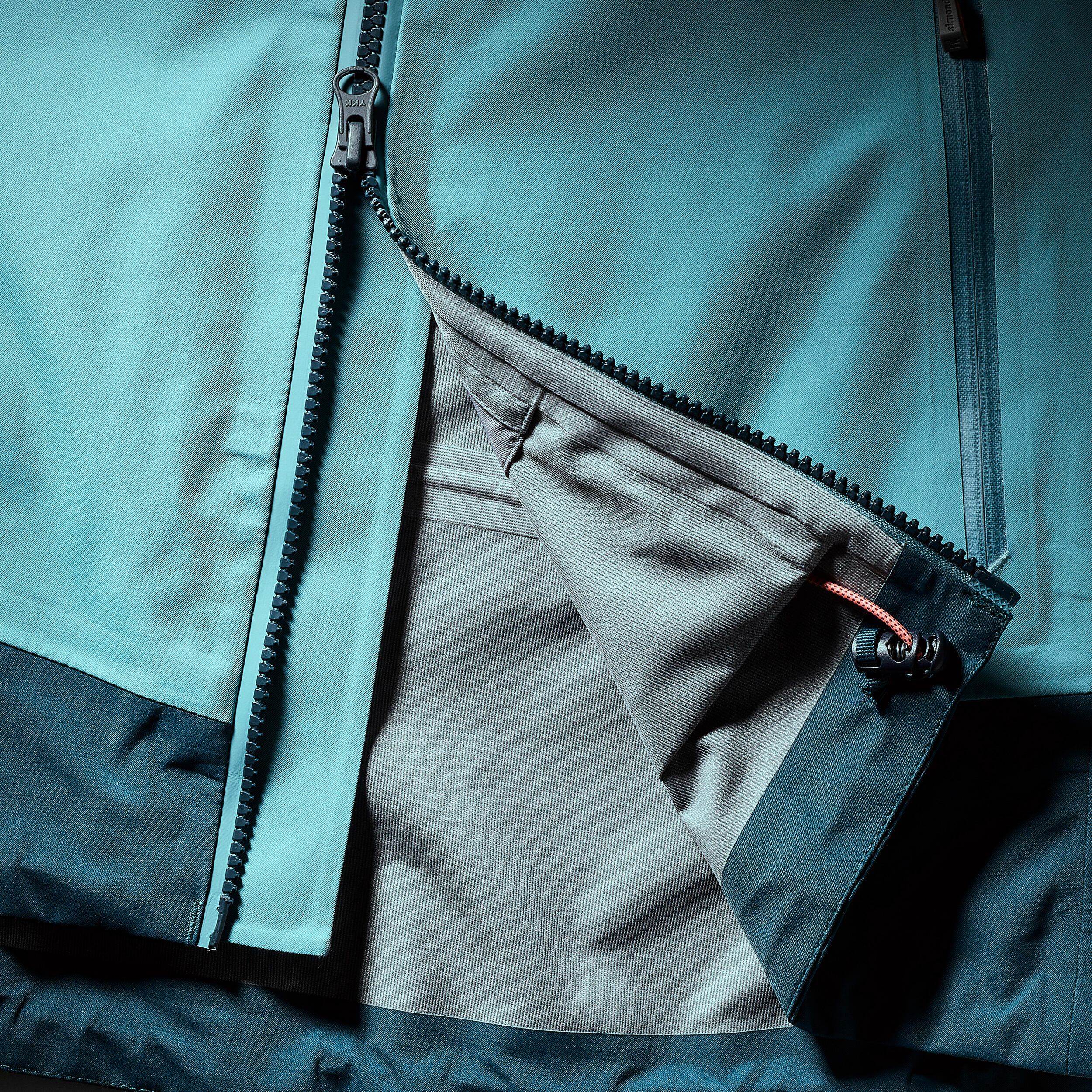 הרוכסן הראשי של ז'קט EVO MOUNTAINEERING הוא רוכסן כפול מהדור החדש המציע איטום למים שזהה לזה של רוכסני הסיליקון הקלאסיים (בדומה לאלו של הכיסים), אך הוא גמיש יותר, מה שמשפר את כושר הדחיסה של המעיל בעת אחסון. בנוסף, קל יותר להשתמש ברוכסן הזה ולכן הוא גם עמיד יותר. הרוכסן הדו-כיווני מאפשר להשתמש ברתמה מתחת למעיל. קל יותר להתמודד עם משיכת הרוכסן בעת עטיית כפפות.