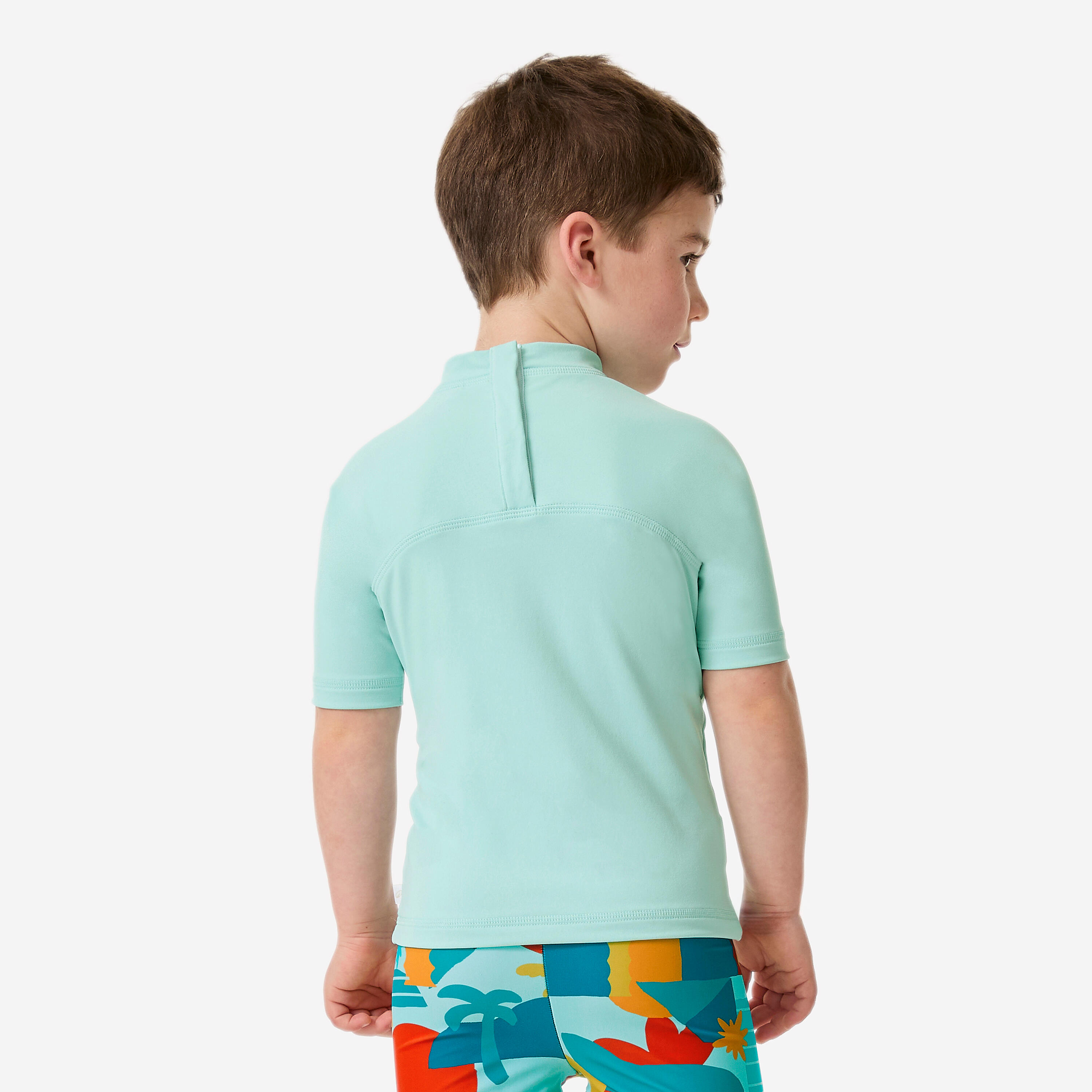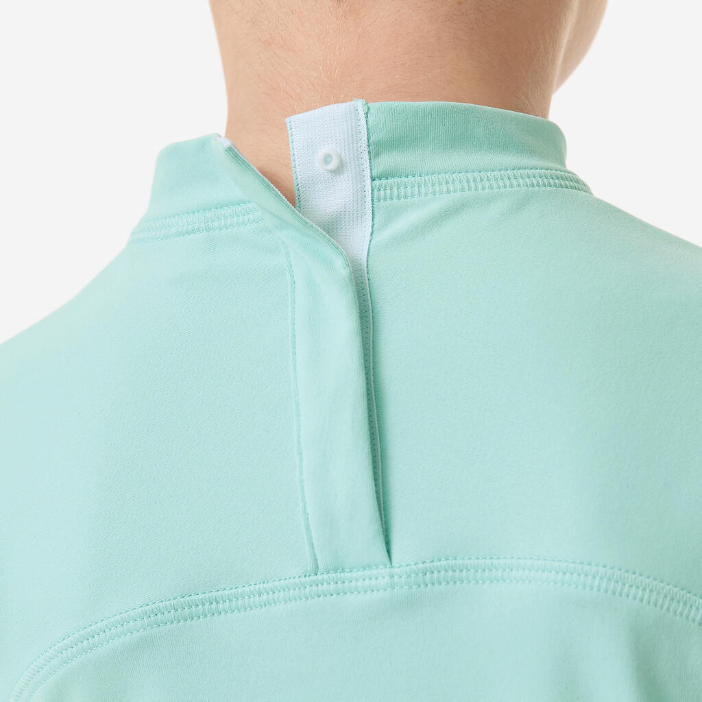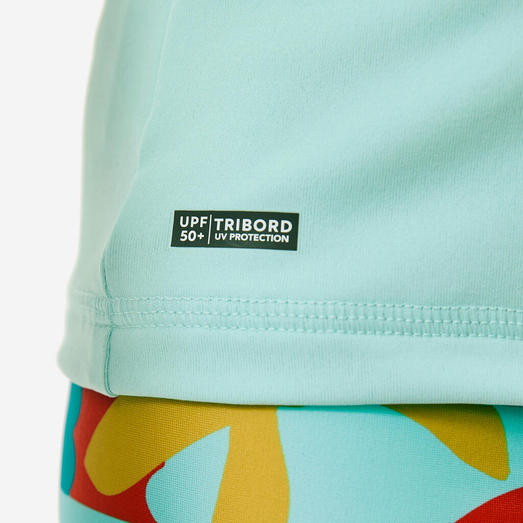חולצת גלישה קצרה בעלת הגנה מפני קרינת UV. לבישה קלה דרך הראש עם תיקתקים מאחור.