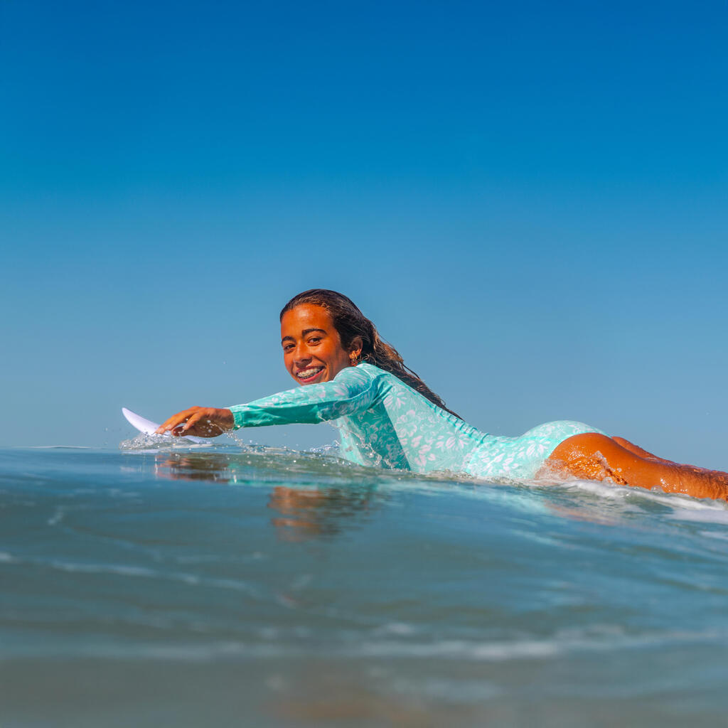 הגזרה המכסה והבד של בגד הים מגינים על הגולשת מהשמש עם הגנה של UPF50+