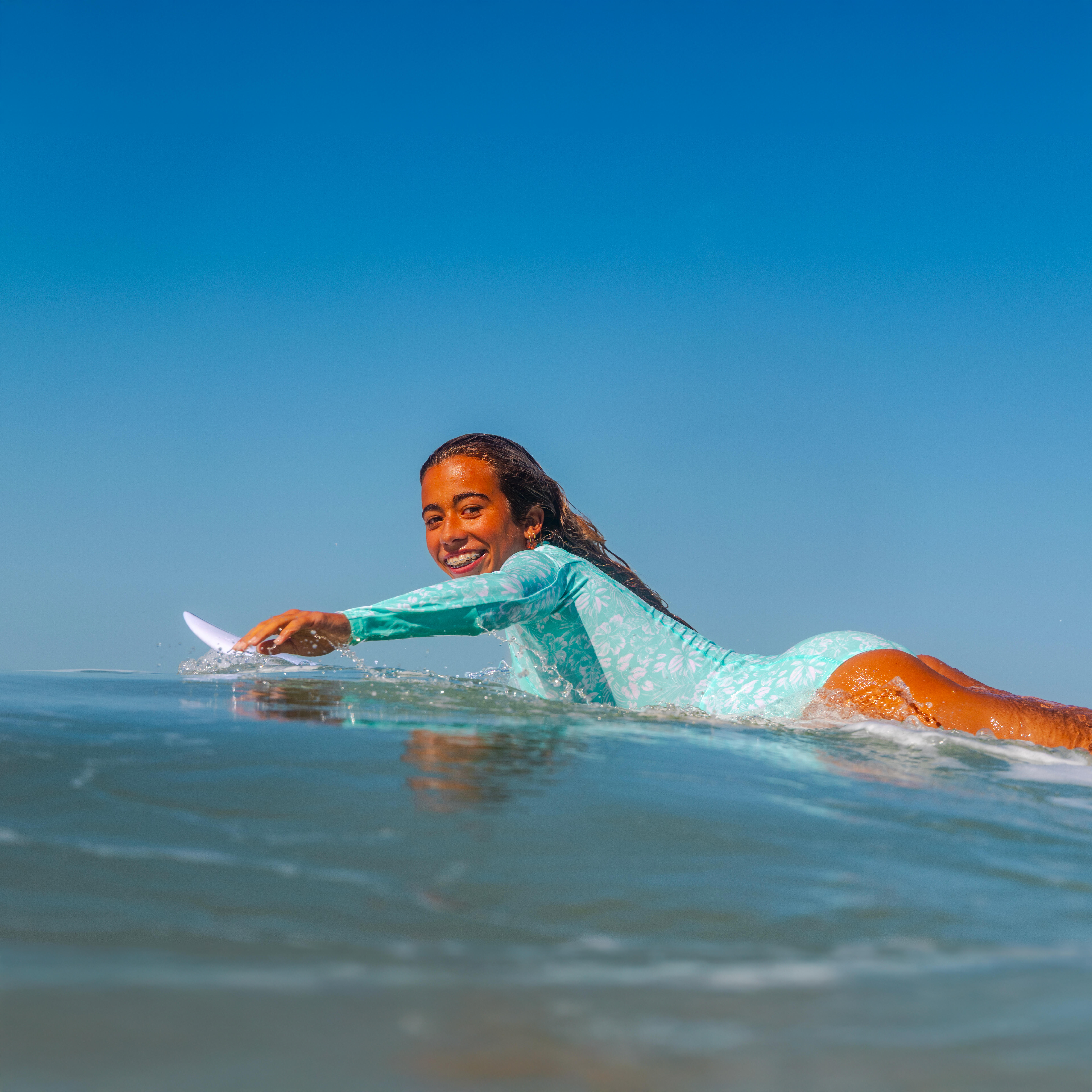 פיתחנו את בגד הים השלם עם השרוולים הארוכים מדגם LUCY לכל הגולשות הצעירות הרוצות לגלוש עם בגד ים ללא החשש שיזוז ממקומו או ייפול.הגזרה עוצבה גם כדי למנוע חיכוך בין הגלשן לשעווה.