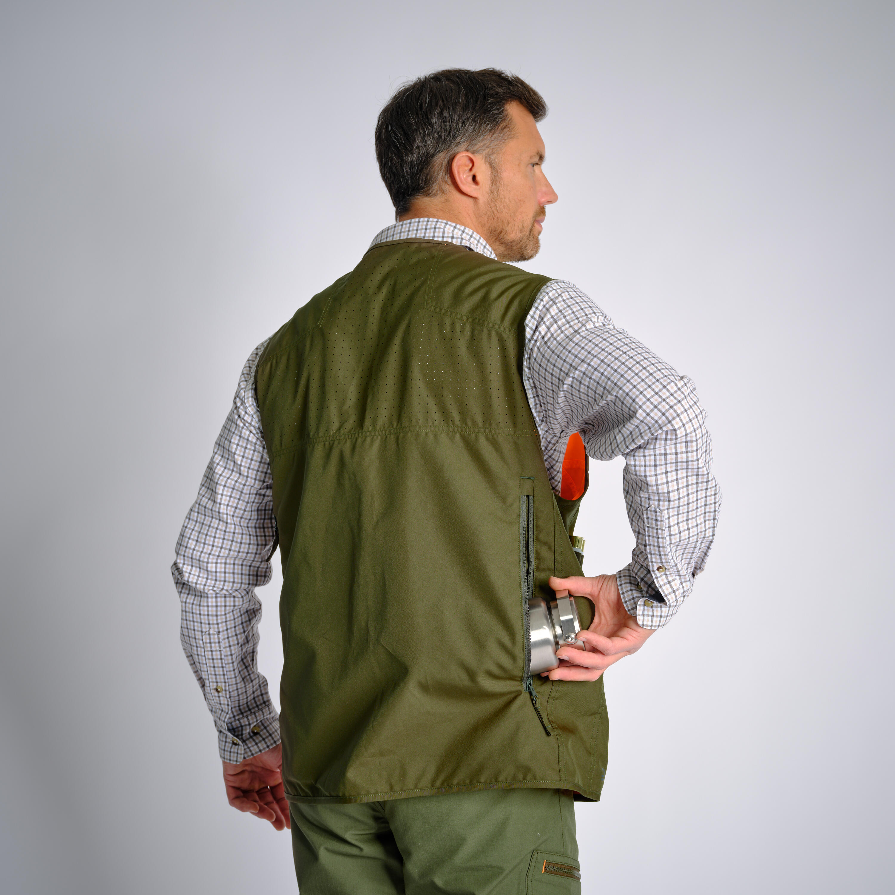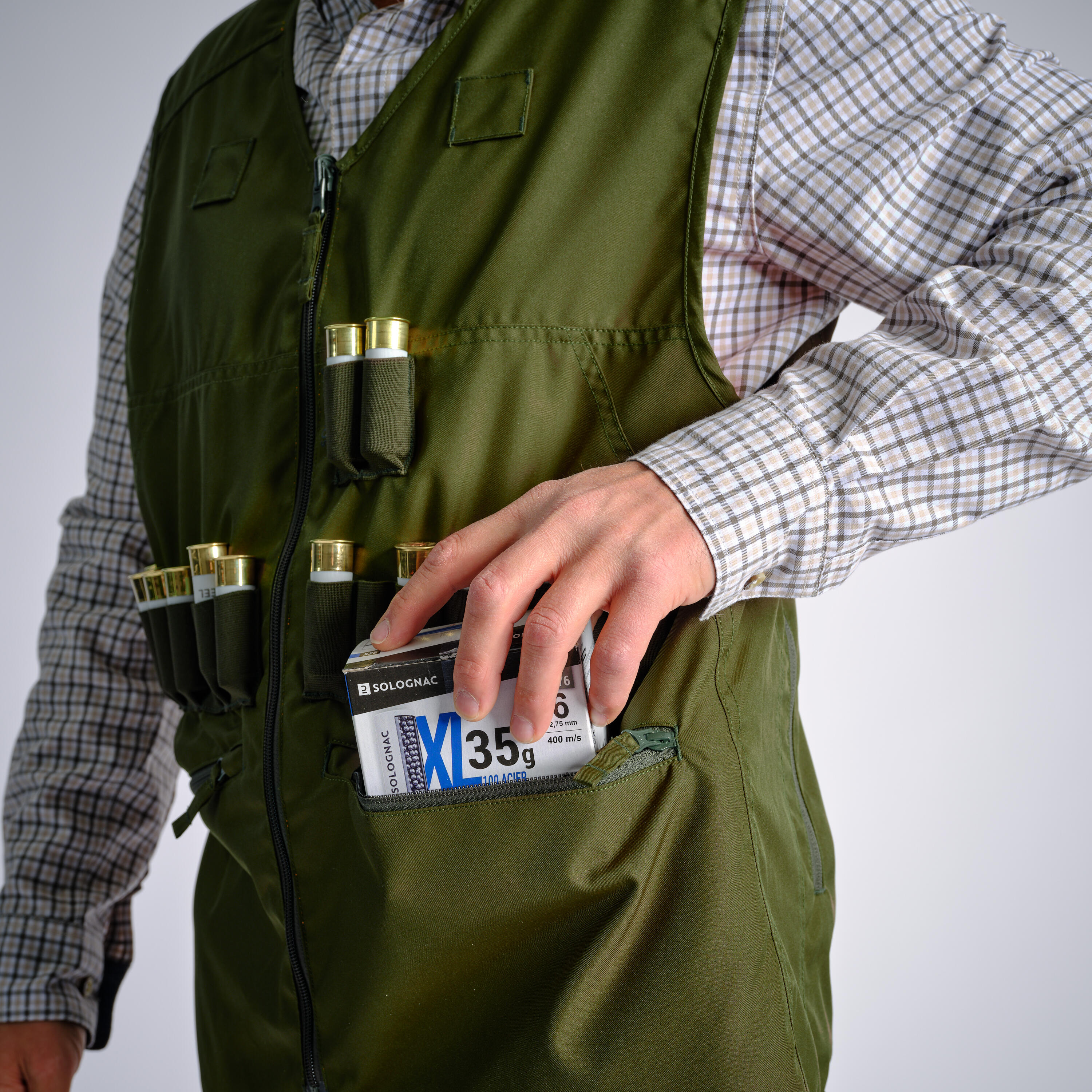 וסט PPE בעל נראות גבוהה, ירוק בצד אחד וכתום-ניאון מהצד השני, מקדם בטיחות ציד. יש לו תא לציד עם רוכסן, 2 כיסים גדולים עם רוכסן ו-18 תאים שמיועדים למחסניות שלכם