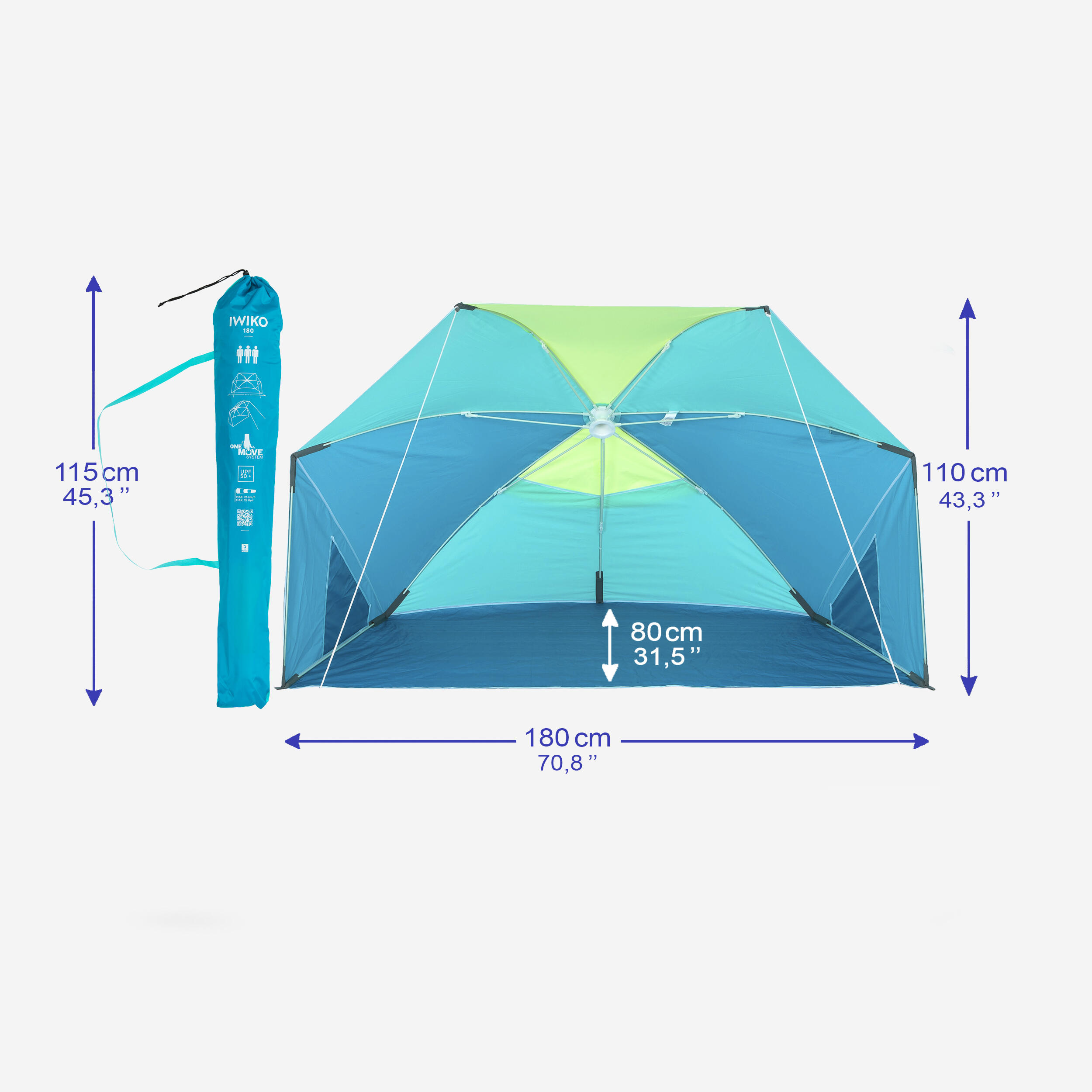 מחסה החוף מדגם IWIKO 180 ניתן לקיפול ופתיחה תוך מספר שניות, הודות למערכת הפתיחה הייחודית שלו. הפתרון האידאלי להנאה בחוף עם ילדים. מידות - אורך 180 ‏‎x ‏גובה 110 ‏‎x ‏עומק 80 ס"מ.