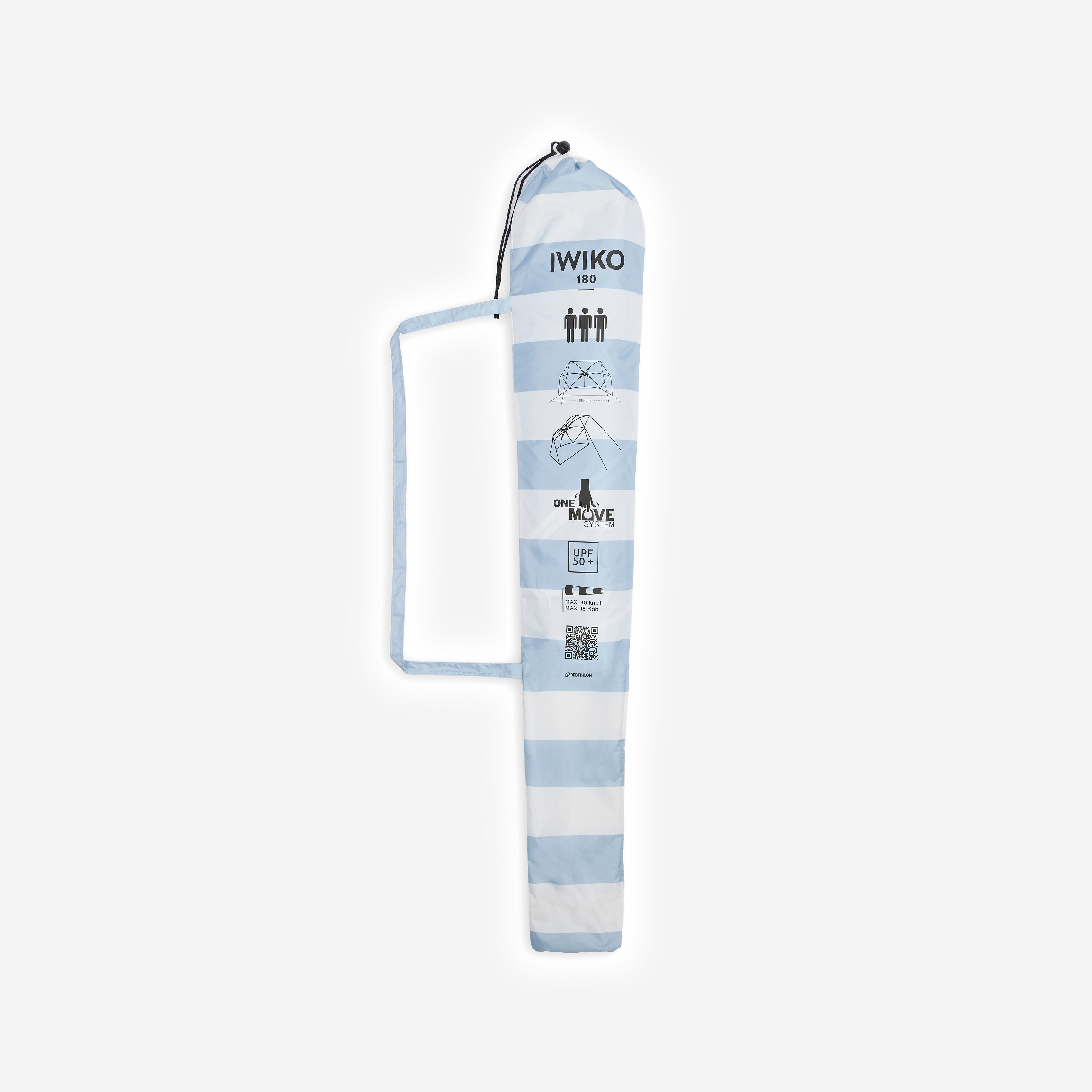 אפשר לאחסן את מחסה החוף מדגם IWIKO בתוך התיק הייעודי הכלול. מידות התיק (ריק): 112x24 ס"מ.