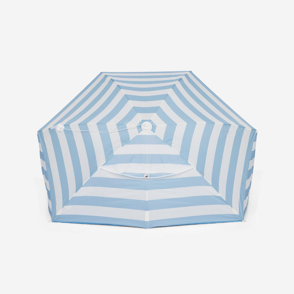 מערכת פתיחה וסגירה מיידית. מחסה החוף נפתח במשיכה בטבעת בצידו האחורי ונסגר בתנועה אחת, על ידי לחיצה על כפתור הסגירה.