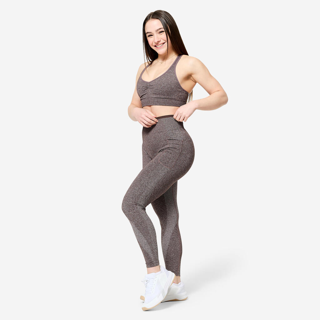חזיית הספורט עם התמיכה הקלה עוצבה כדי שתרגישו יפות במהלך אימוני המשקולות או בחדר הכושר. אפשר ללבוש אותה בלי שום שכבה מעליהגזרת קפלים מרופדת בצד הקדמי, קאפים נשלפים ומפתח וי יחמיאו לחזה. שלבו עם הטייץ התואם להשלמת הלוק.
