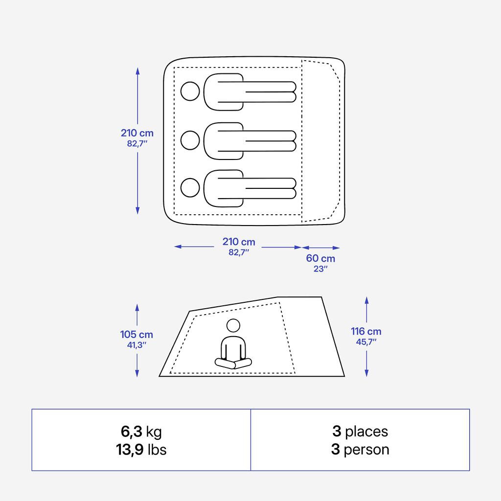 אוהל XL ל-3 אנשים בפתיחה מהירה שמבטיח הרכבה מהירה ומספיק מקום באוהל הקמפינג לישיבה נוחה.