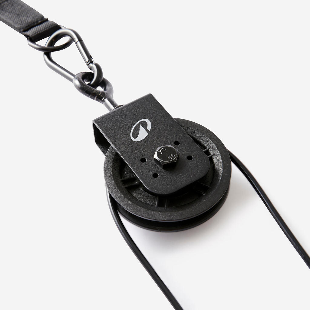 תוך 30 שניות בלבד תוכלו להרכיב מערכת גלגלת לאימון משקולות משלכם, בדיוק כמו בחדר הכושר. פשוט: - כרכו את הרצועה סביב מוט, גזע עץ וכו'. - הדקו את השאקל לרצועה - חברו את הגלגלת אל השאקל - העבירו את הכבל דרך הגלגלת - הניחו את ידית אימון המשקולות בצד אחד, ואת מעמד משקלות הדיסק בצד השני.