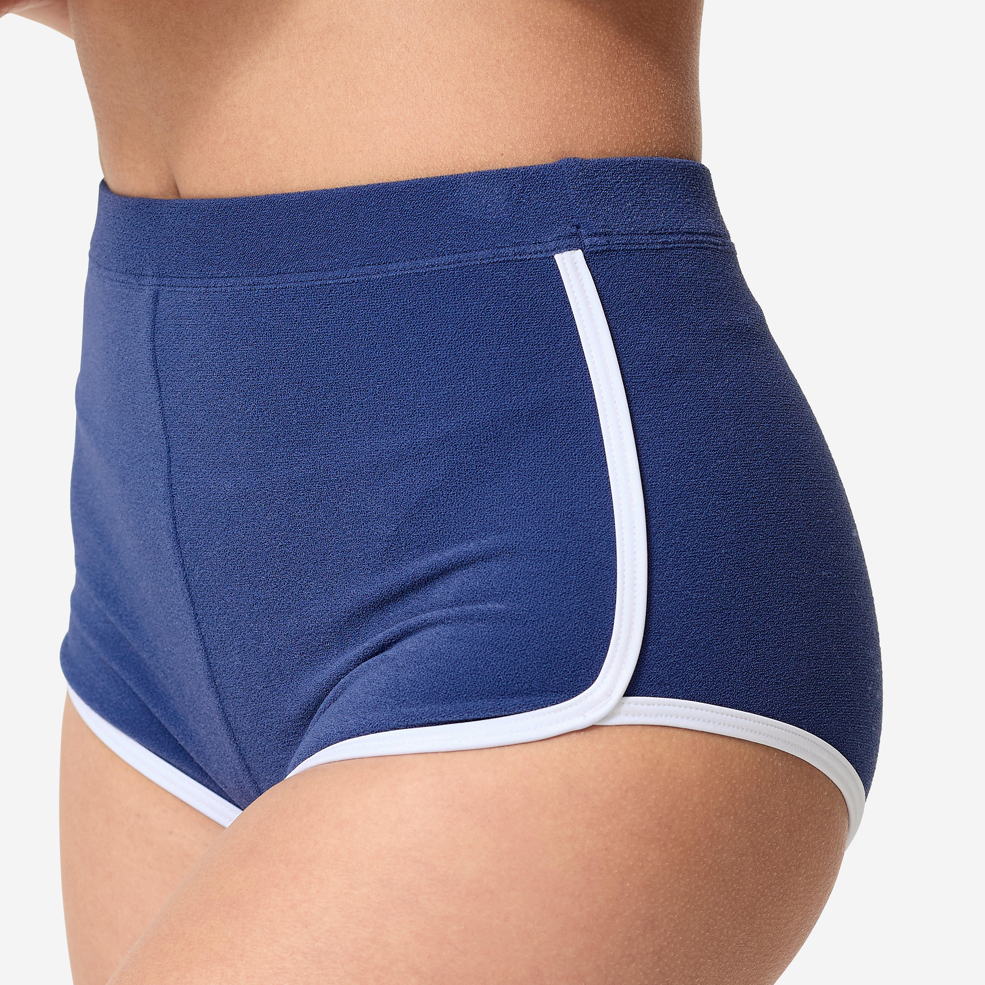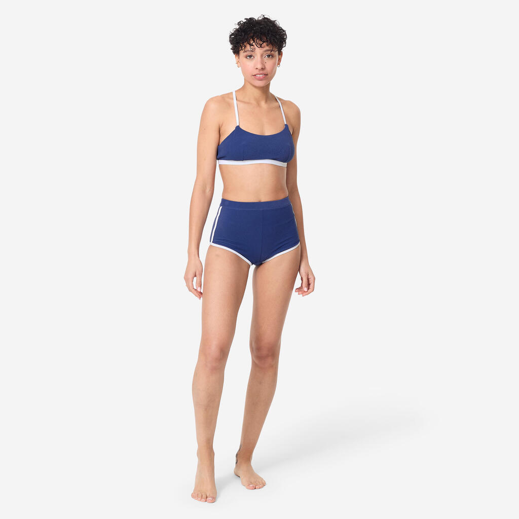 ביקיני חלק תחתון מבד דמוי בד טרי, פסים לבנים ומותניים גבוהים, שמבטיח לגולשת אחיזה טובה בגלים ומראה ספורטיבי-רטרו.
